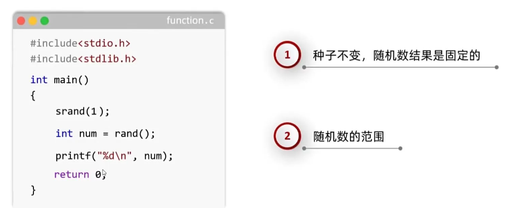 {//1.设置种子//初始值,因为每一个随机数都是通过前一个数字再结合一系列复杂的计算得到的srand(1);//2.获取随机数int num = rand();//3.输出打印printf("%d\n", num);return 0;