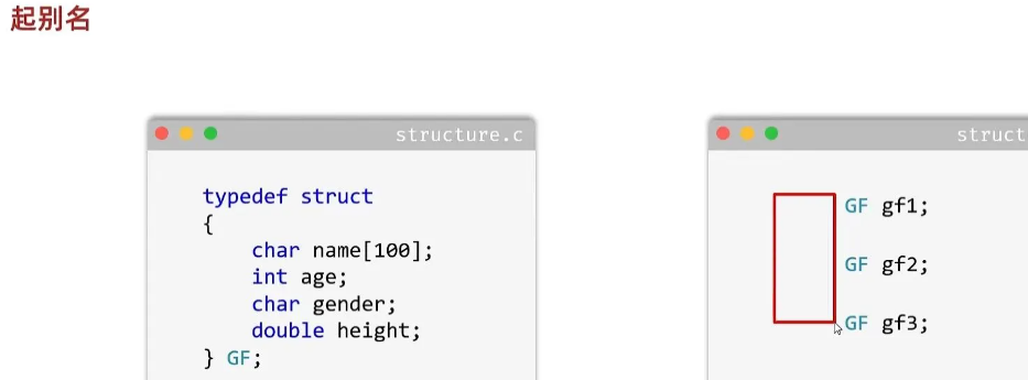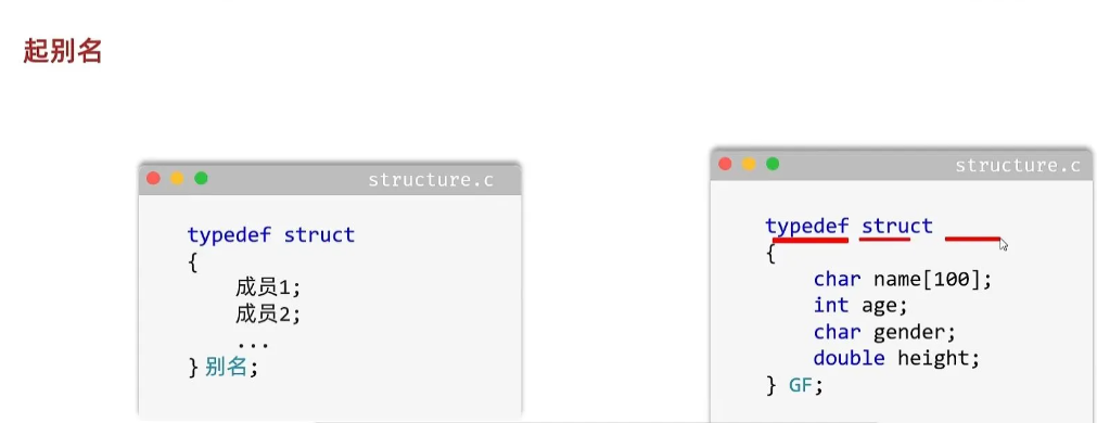 };struct Student{char name[100];int age;char gender;double heigth;//因为此时还没有起别名,所以只要用到结构体前面必须要写structstruct Message msg;