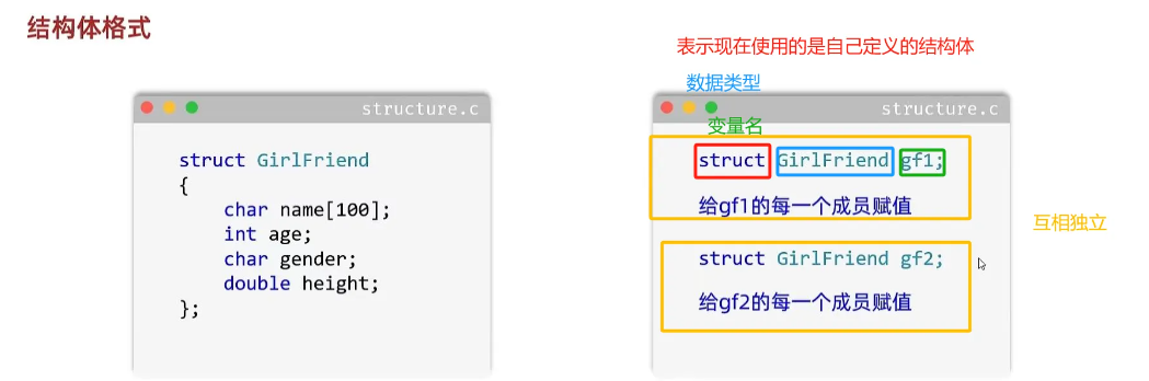 int main(){struct GirlFriend gf1;strcpy(gf1.name,"jjj");gf1.age = 18;gf1.gender = 'F';gf1.height = 1.78;printf("名字为:%s\n",gf1.name);printf("年龄为:%d\n",gf1.age);printf("性别为:%c\n",gf1.gender);printf("身高为:%.2lf",gf1.height);return 0 ;