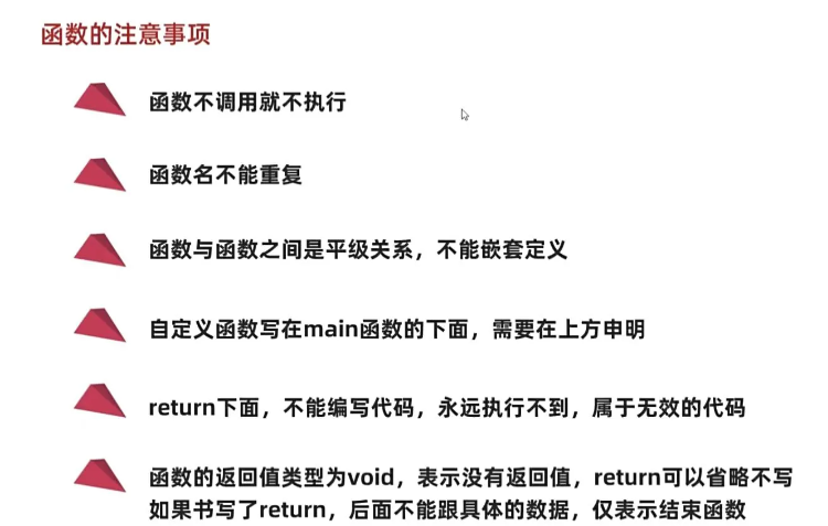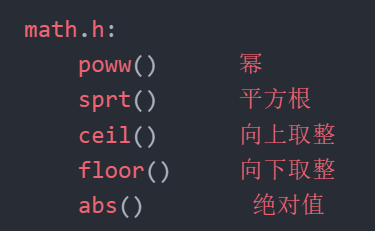 {/*math.h:poww() 幂sprt() 平方根ceil() 向上取整floor() 向下取整abs() 绝对值*///1.powdouble res1 = pow(2, 3);printf("%lf\n", res1);//2.sqrtdouble res2 = sqrt(9);printf("%lf\n", res2);//3.ceildouble res3 = ceil(13.2);printf("%lf\n", res3);//4.floordouble res4 = floor(13.2);printf("%lf\n", res4);//5.absint res5= abs(-45);printf("%d\n", res5);return 0;