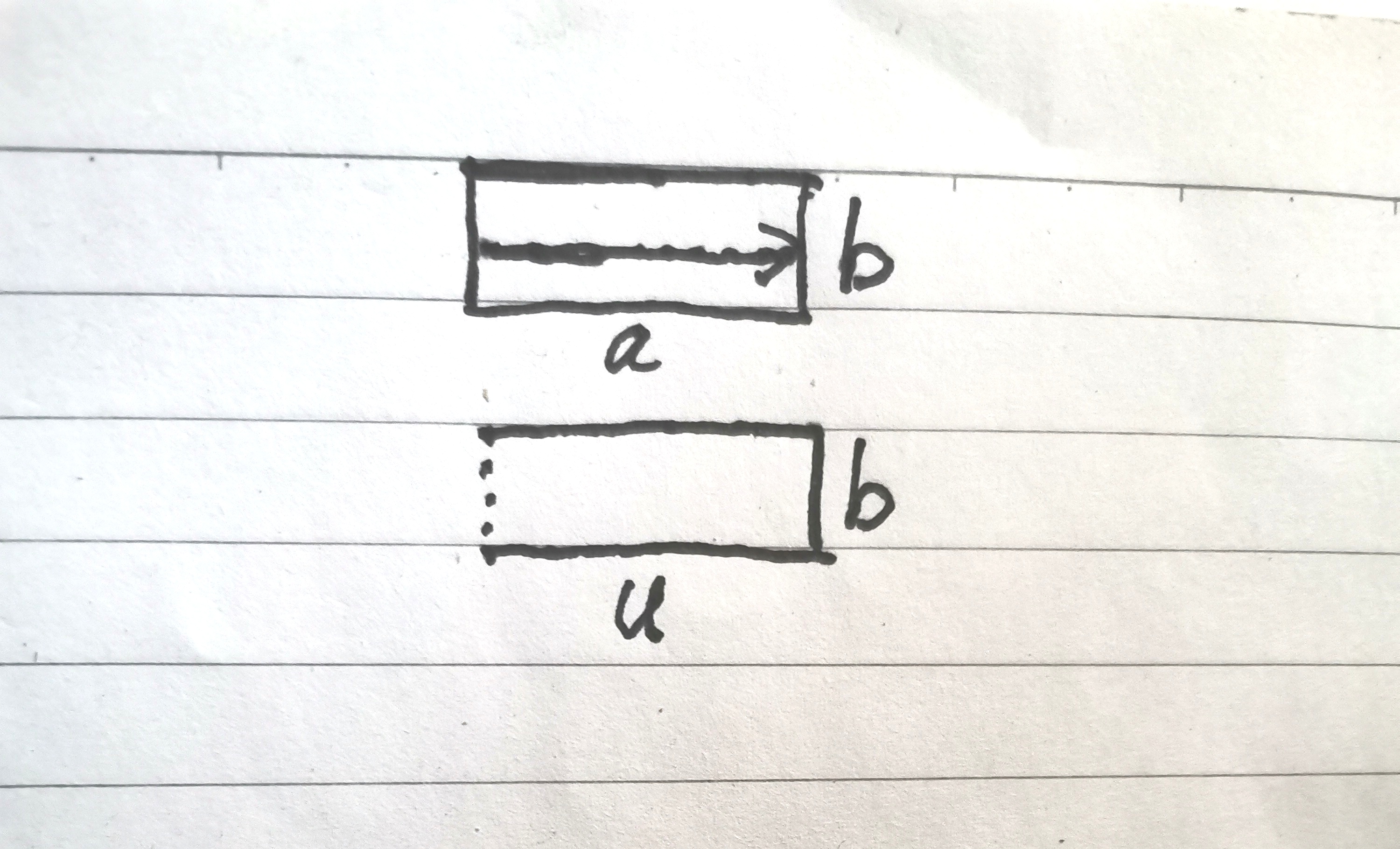 ○●分别表示空心点和实心点,本文的图形是实心点的点集。区间:【0 ,2】⊂R和(0 ,2】⊂R的图像都是直线段⊂R轴。如草图所示有长、宽分别是a与b的长方形盘x由无穷多直线段组成,x的面积h=ab。x有四条边,如图所示x的一条边移动到其对面的边上与该边重合就使x失去部分元点(失去一条直线段)变为长、宽分别是u和b的长方形盘y,y的面积是g=ub。看图可知x失去部分元点变为其真子集y不是x的刚体运动——说明y⊂x不≌x,据小学≌图概念y不≌x说明两者形状相同(两者都是长方形盘)大小不同即面积不同。因y⊂x只是x的一部分所以显然y的面积g小于的x的面积h——说明直线段u⊂a比a短(请读者注意长方形盘面积的公式)。可见由直线段组成的x失去一条直线段变为y就使其面积h=ab变小为g=ub(说明u比a小),如图所示由点组成的直线段a失去一个元点变为直线段u⊂a短于a。这一事实说明直线段有宽度,点有长度。