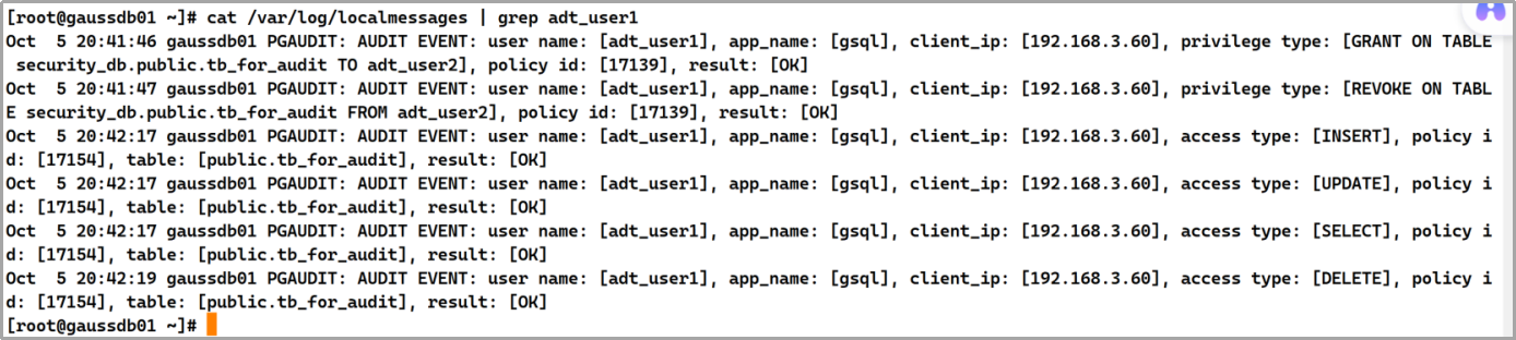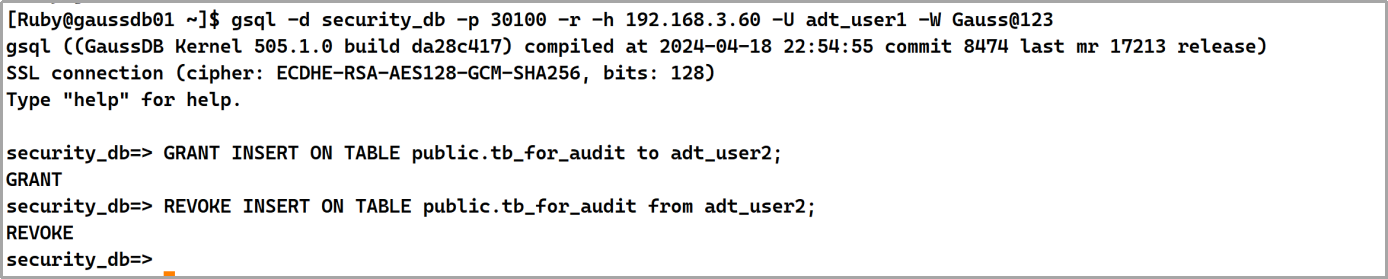 gsql -d security_db -p 30100 -r -h 192.168.3.60 -U adt_user1 -W Gauss@123