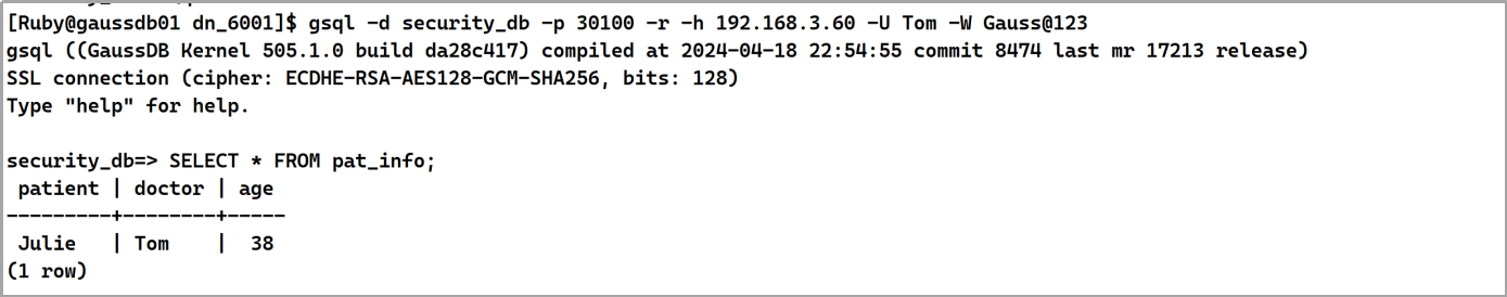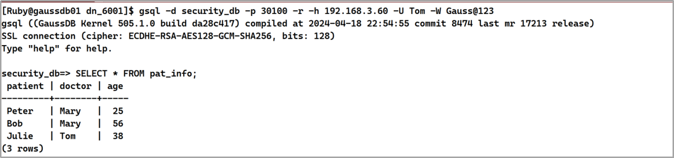 gsql -d security_db -p 30100 -r -h 192.168.3.60 -U Tom -W Gauss@123