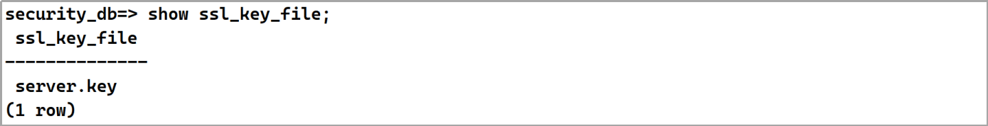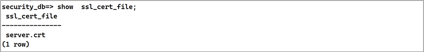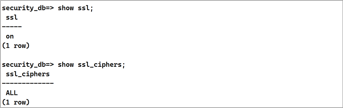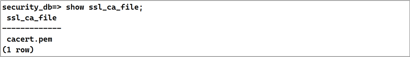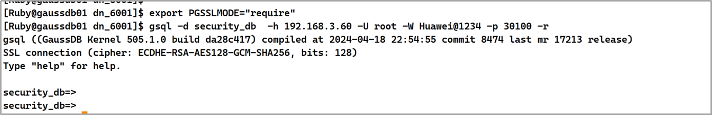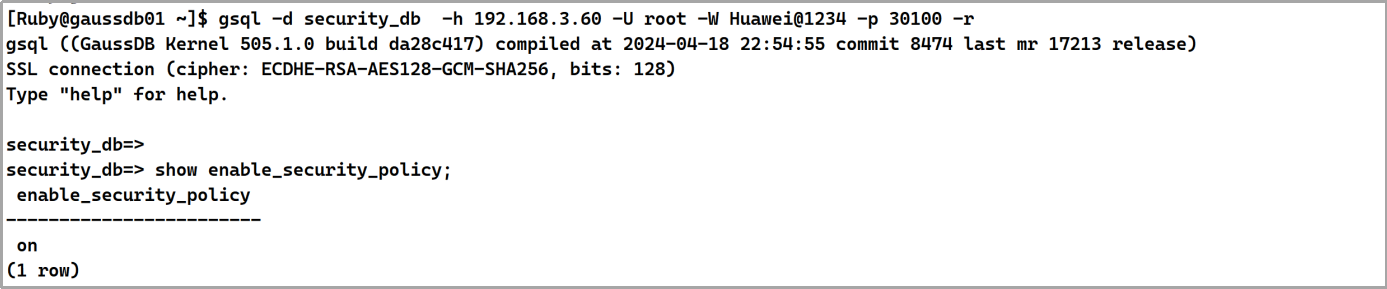 gsql -d security_db -h 192.168.3.60 -U root -W Huawei@1234 -p 30100 -rshow ssl;