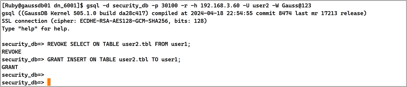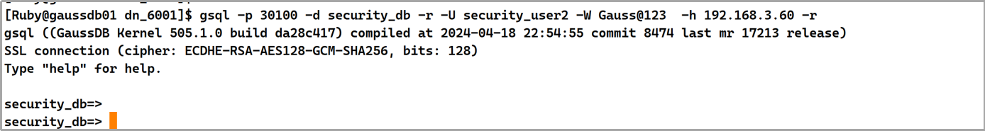 gsql -p 30100 -d security_db -r -U security_user2 -W Gauss@123 -h 192.168.3.60 -r
