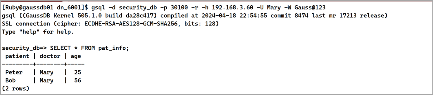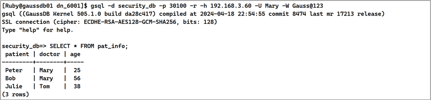 gsql -d security_db -p 30100 -r -h 192.168.3.60 -U Mary -W Gauss@123