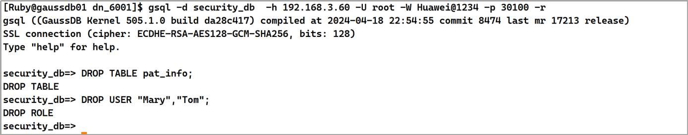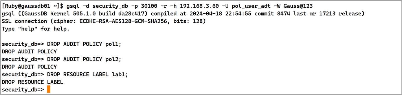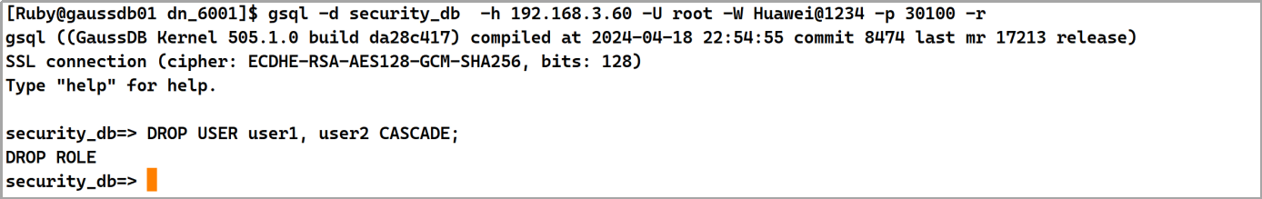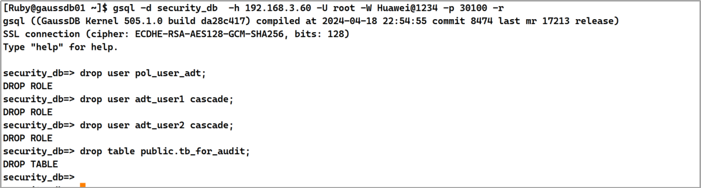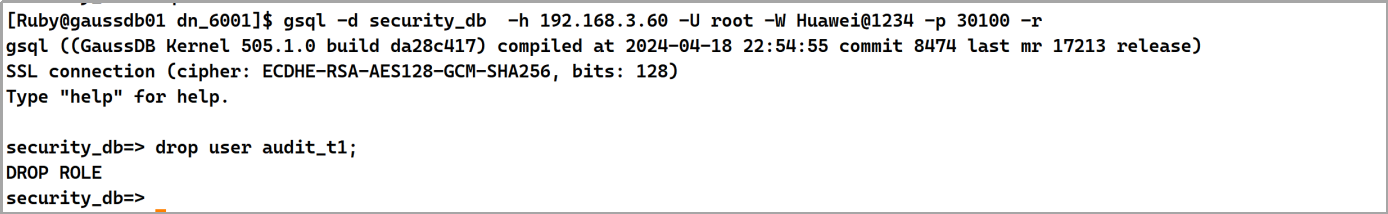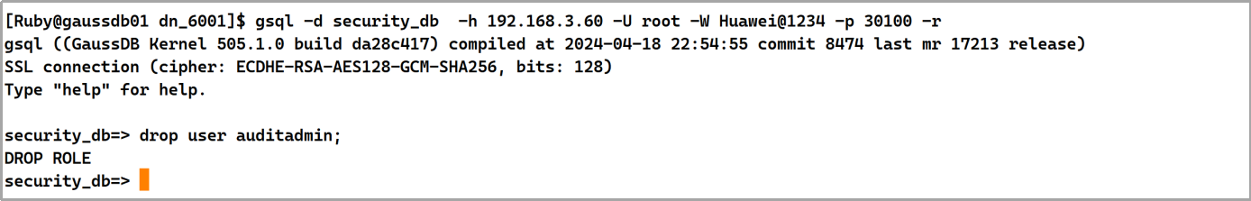 gsql -d security_db -h 192.168.3.60 -U root -W Huawei@1234 -p 30100 -rdrop user auditadmin;