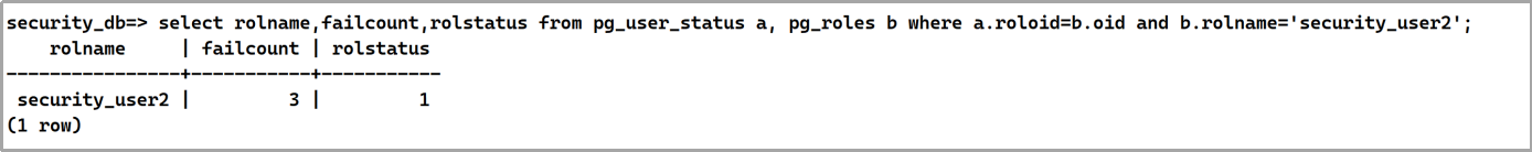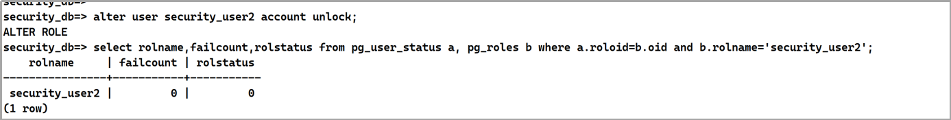 gsql -d security_db -h 192.168.3.60 -U root -W Huawei@1234 -p 30100 -rselect rolname,failcount,rolstatus from pg_user_status a, pg_roles b where a.roloid=b.oid and b.rolname='security_user2';alter user security_user2 account unlock;select rolname,failcount,rolstatus from pg_user_status a, pg_roles b where a.roloid=b.oid and b.rolname='security_user2';