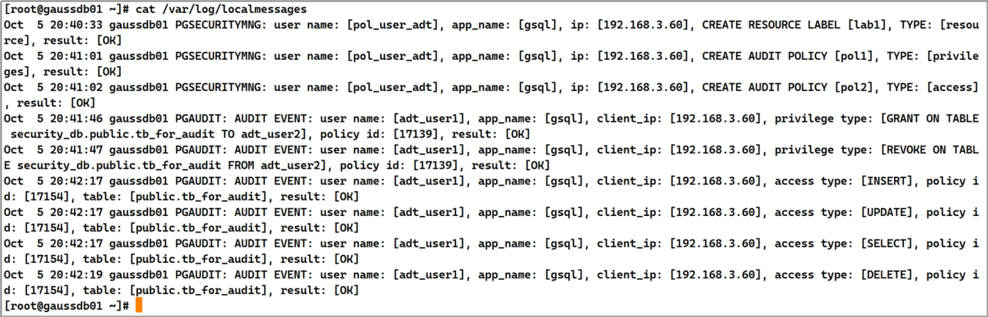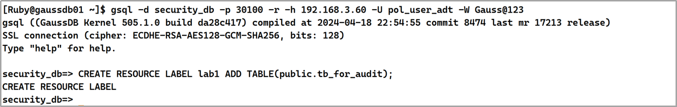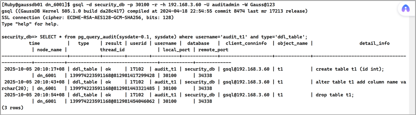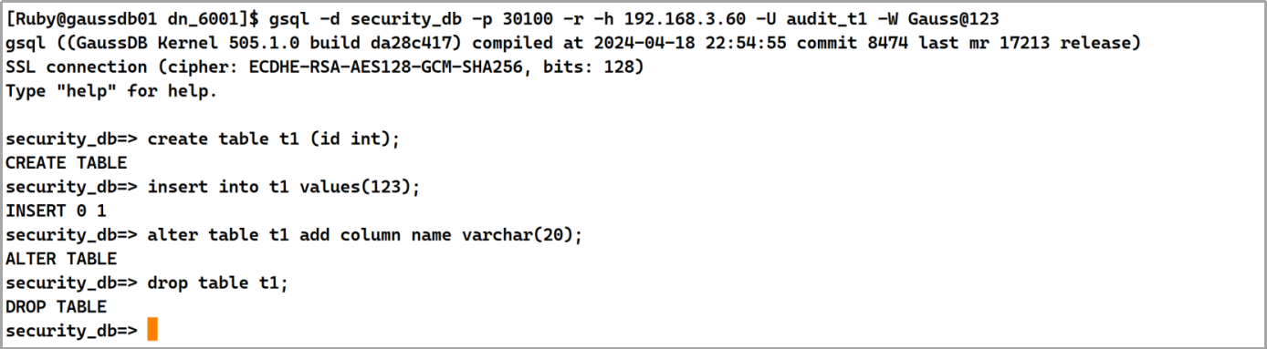 gsql -d security_db -p 30100 -r -h 192.168.3.60 -U audit_t1 -W Gauss@123create table t1 (id int);