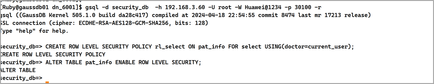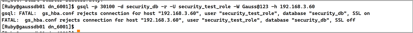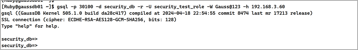 gsql -p30100 -d security_db -r -U security_test_role -W Gauss@123 -h 192.168.3.60