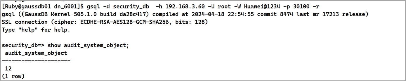 gsql -d security_db -p 30100 -r -h 192.168.3.60 -U auditadmin -W Gauss@123