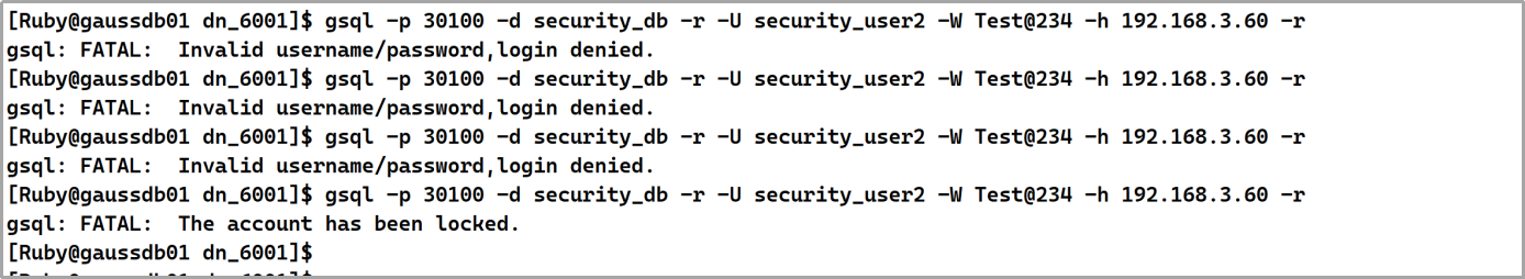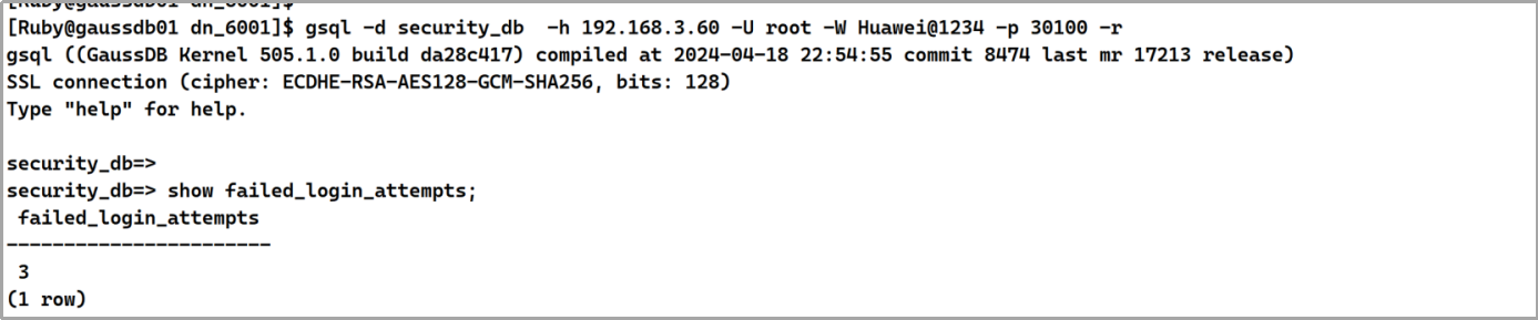 gsql -d security_db -h 192.168.3.60 -U root -W Huawei@1234 -p 30100 -rshow failed_login_attempts;