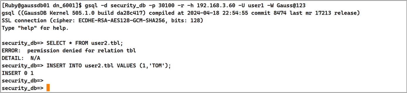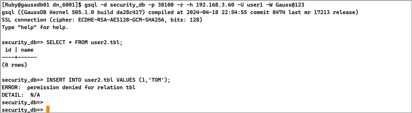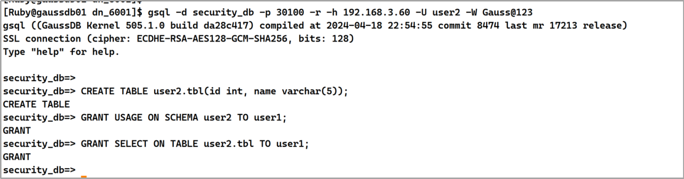 gsql -d security_db -p 30100 -r -h 192.168.3.60 -U role1 -W Gauss@123