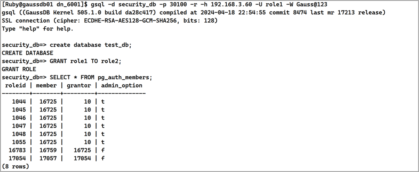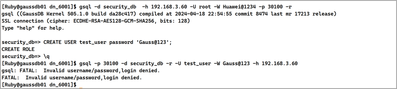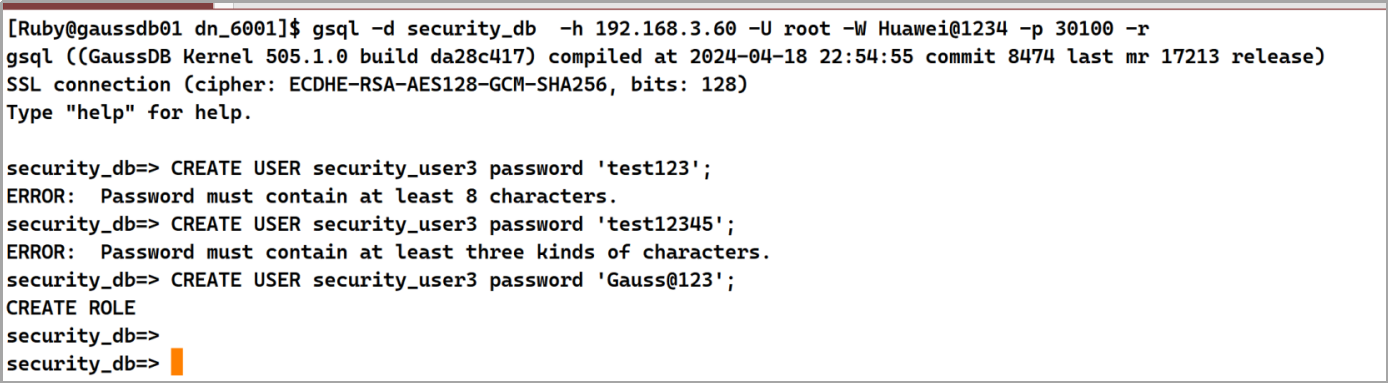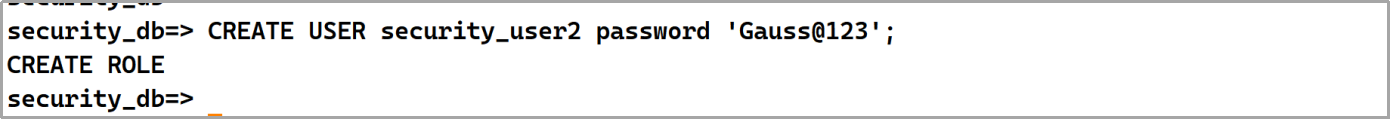 gsql -d security_db -h 192.168.3.60 -U root -W Huawei@1234 -p 30100 -rCREATE ROLE role1 WITH password 'Gauss@123';