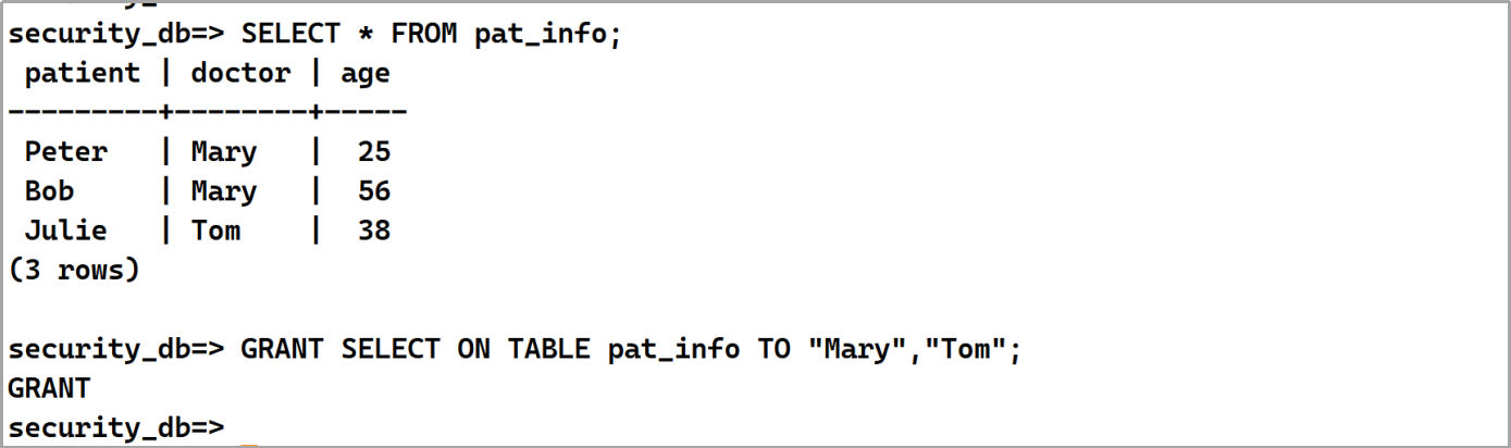 GRANT SELECT ON TABLE pat_info TO "Mary","Tom";