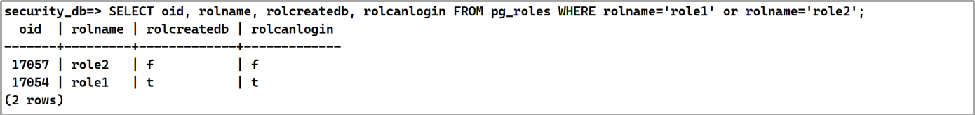 SELECT oid, rolname, rolcreatedb, rolcanlogin FROM pg_roles WHERE rolname='role1' or rolname='role2';