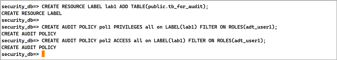 CREATE AUDIT POLICY pol1 PRIVILEGES all on LABEL(lab1) FILTER ON ROLES(adt_user1);