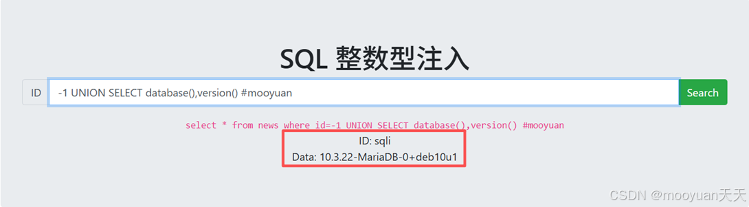 提交后,页面会在相应位置显示数据库名(‘sqli’)和版本(“10.3.22-MariaDB-0+deb10u1”)。