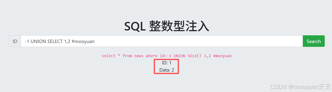 确定字段数为2后,我们使用UNION SELECT联合查询来确定哪些字段的内容会显示在网页上。构造Payload:-1 UNION SELECT 1,2。