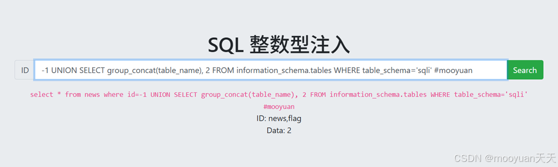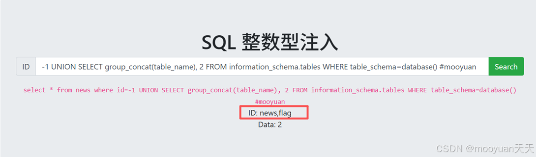 此语句会将当前数据库下的所有表名合并成一个字符串,并显示在第1个回显点上,ID对应的flag和news就是数据库中的表格,其中flag表就是我们要下一步查询的表格。