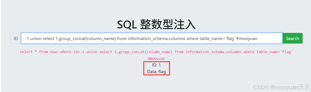 系统表,获取该表包含的所有列名结构。 - 提取最终数据: 直接查询目标表的目标列,将所需数据(如Flag)通过回显点输出到页面,完成整个联合注入攻击流程。