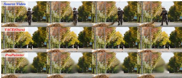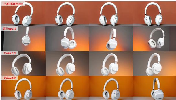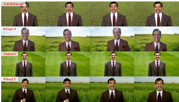 VACE (我们的) | 56.72% | 96.12% | 60.00% | 66.41% | 98.84% | 25.27% | 94.09% | 97.27% | 74.99% | 3.10 | 3.92 | 2.66 | 3.23 | ||