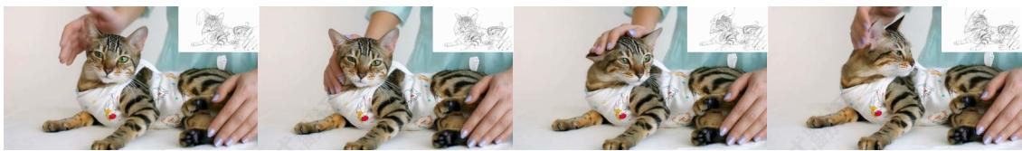 TASK-SCRIBBLE: 一位身穿浅蓝色衬衫的人正轻柔地抚摸躺在白色桌子上的虎斑猫。猫身上穿着带有卡通人物的白色服装,看起来放松而满足,随着那人抚摸它的头部和身体。背景简洁且颜色浅淡,使人和猫的互动成为焦点。相机保持静止……