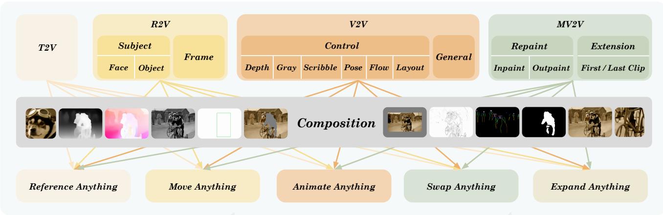 当前视频生成与编辑任务高度碎片化,不同任务(如参考图生成、视频编辑、局部重绘、时序扩展等)通常依赖独立模型,导致部署成本高、用户交互复杂,且难以实现多任务协同创作。