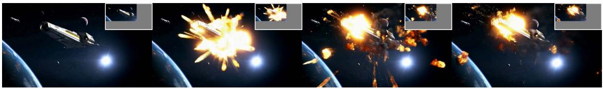 TASK-OUTPAINTING:一艘巨大的飞船正在太空中飞行,背景中可见一艘较小的飞船。突然,较大的飞船爆炸成巨大的火球,碎片向四面八方飞散。爆炸非常剧烈和明亮,火焰和烟雾从残骸中腾起。较小的飞船完好无损,继续飞离现场。……