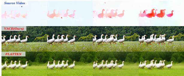 定性结果。在图1中,我们展示了VACE单模型在各个任务上的结果。很明显,模型在视频质量和时间一致性方面达到了很高的性能水平。此外,在图4中展示的组合任务中,我们的模型展现出令人印象深刻的能力,有效地整合了不同的模态和任务,生成了现有单模型或多模型无法生成的结果,从而在视频生成和编辑领域展示了其强大的潜力。例如,在“移动任何东西”的案例中,通过提供一个输入图像和运动轨迹,我们能够精确地移动场景中的角色,并保持指定的方向、连贯性和叙事一致性。