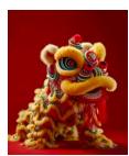 任务对象:一件色彩鲜艳的中国舞狮服装在深红色背景下醒目地站立着,散发着传统文化的意义和节日气氛。该服装具有精致的细节,边缘装饰着黄色毛皮,并饰有复杂的绿色、红色和金色图案。装饰品如大而富有表现力的眼睛、宽大的带牙齿的笑容……