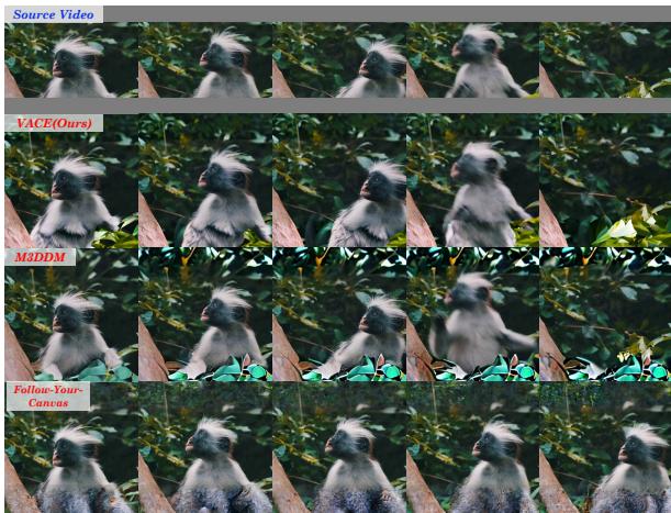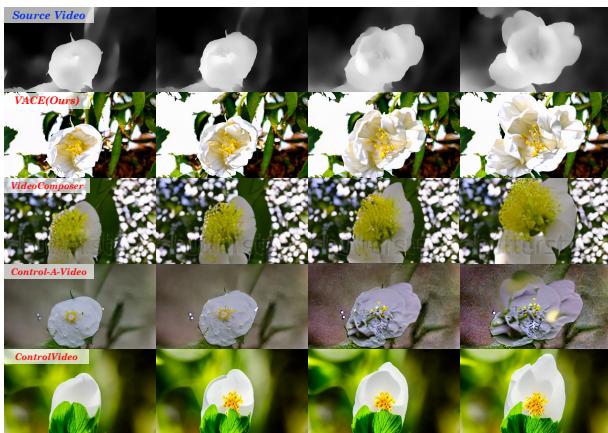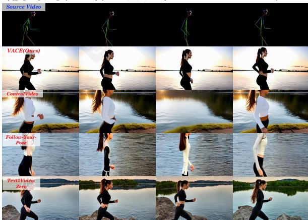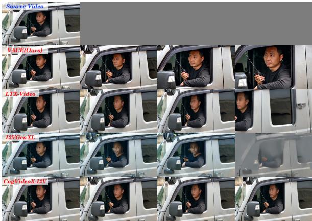 在图.8中,我们展示了基于LTX-Video-2B的VACE与其他方法的比较可视化[22],包括与I2VGenXL[77],CogVideoX[73],和LTX-Video-I2V[22]的比较(扩展任务);与ProPainter[82]的比较(无条件修复任务);与Follow-Your-Canvas[8]和M3DDM[17]的比较(外绘任务);与Control-A-Video[10],VideoComposer[68],和ControlVideo[79]的比较(深度控制生成);与Text2Video-Zero[31],ControlVideo[79]和Follow-Your-Pose[40]的比较(姿态控制生成);与FLATTEN[14]的比较(光流控制生成);以及与商业闭源模型Keling1.6[1],Pika2.2[49],和Vidu2.0[66]的比较。