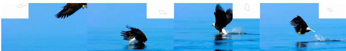 TASK-LAYOUT: 一只鹰在晴朗的天空下飞越平静的蓝色海洋。这只拥有棕色和白色羽毛以及黄色喙的鹰,朝着水面俯冲,翅膀展开宽阔。当它接近水面时,它潜入水中,激起水花,然后带着鱼爪中的鱼浮出水面。鹰随后再次起飞,带着紧握的鱼飞离相机……