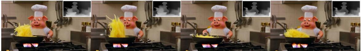 TASK-DEPTH: 一只穿着厨师服的猪站在厨房里,手里拿着一个下方有蓝色火焰的煎锅。猪戴着白色厨师帽和围裙,正在搅拌锅中黄色的碎食物。背景是一个现代化的厨房,配有不锈钢电器、水槽,以及放在台面上的各种厨房工具和容器。光线明亮自然,……
