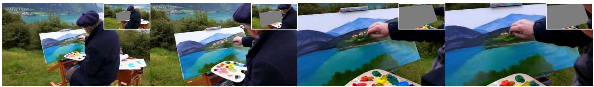 TASK-INPAINTING:一个人在户外画布上作画,使用调色板上的各种颜色的颜料。这个人穿着深蓝色夹克和配套的贝雷帽,坐在木椅子上。画布描绘了一幅风景画,背景有水体和山脉。这个人正在仔细地将绿色颜料涂抹在画布上,为场景添加细节。……