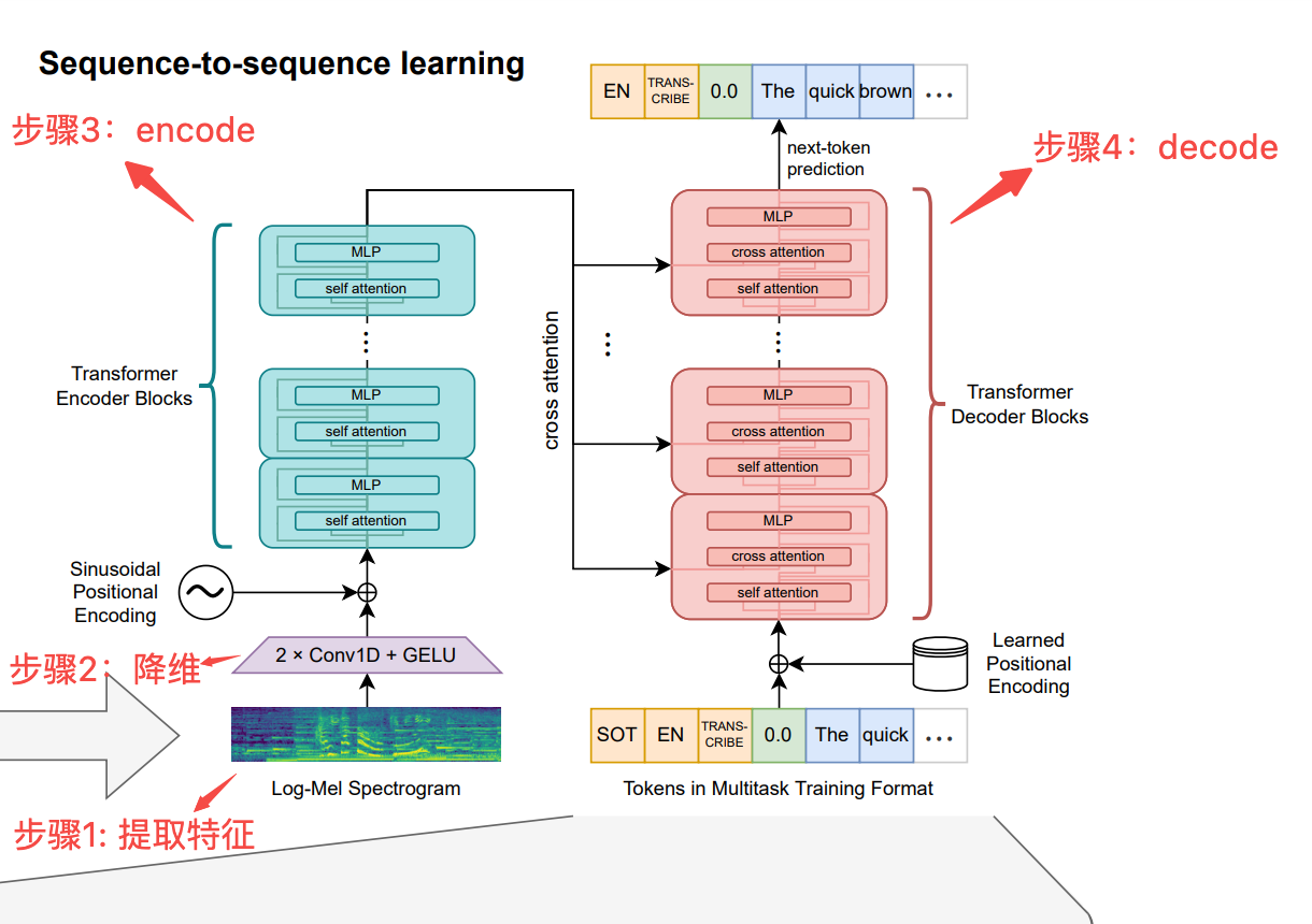 论文(参考文献-1)中whisper框架图如下图所示,可以将推理过程大体分为4个步骤。