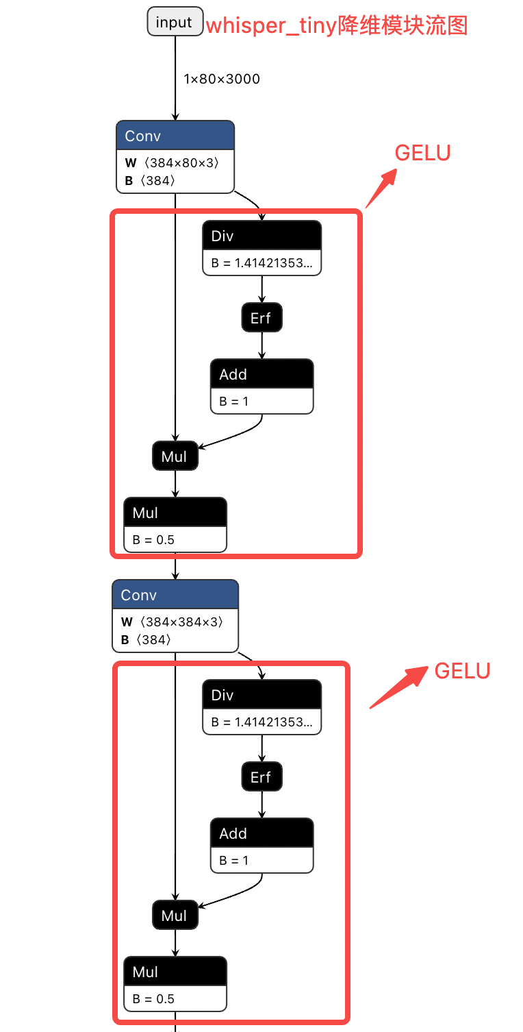 class AudioEncoder(nn.Module):def forward(self, x: Tensor):"""x : torch.Tensor, shape = (batch_size, n_mels, n_ctx)the mel spectrogram of the audio"""# 输入x shape:[1, 80, 3000]x = F.gelu(self.conv1(x)) # kernel_size=3提取局部特征x = F.gelu(self.conv2(x)) # stride=2,实现降维, x shape变为[1, 384, 1500]x = x.permute(0, 2, 1) # [1, 384, 1500]-> [1, 1500, 384]