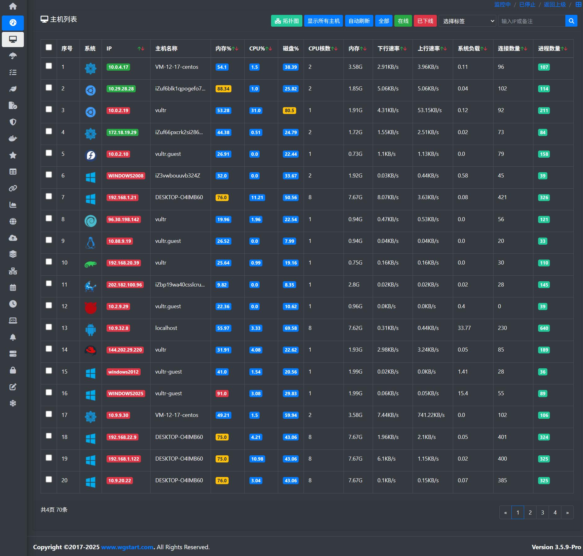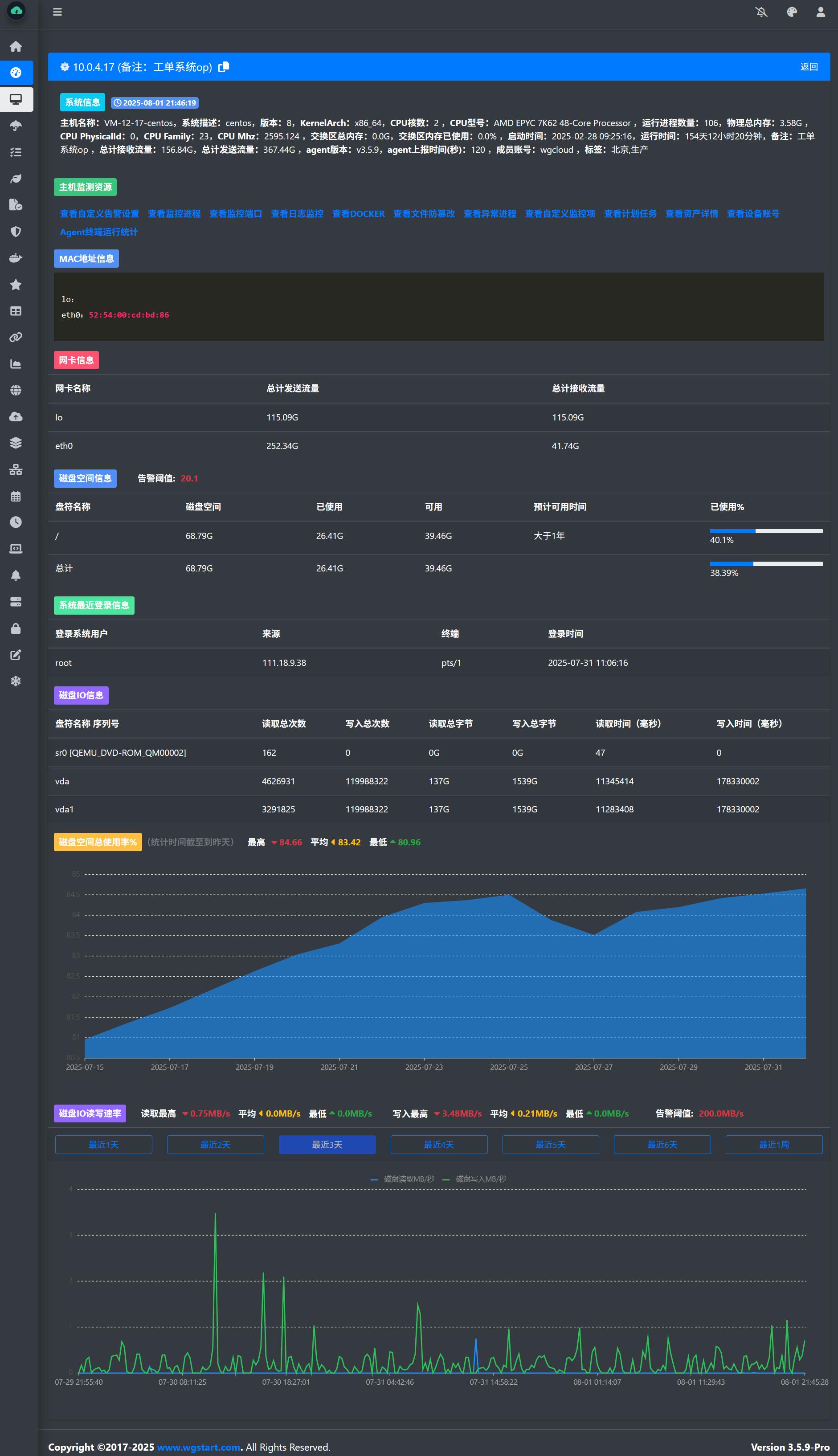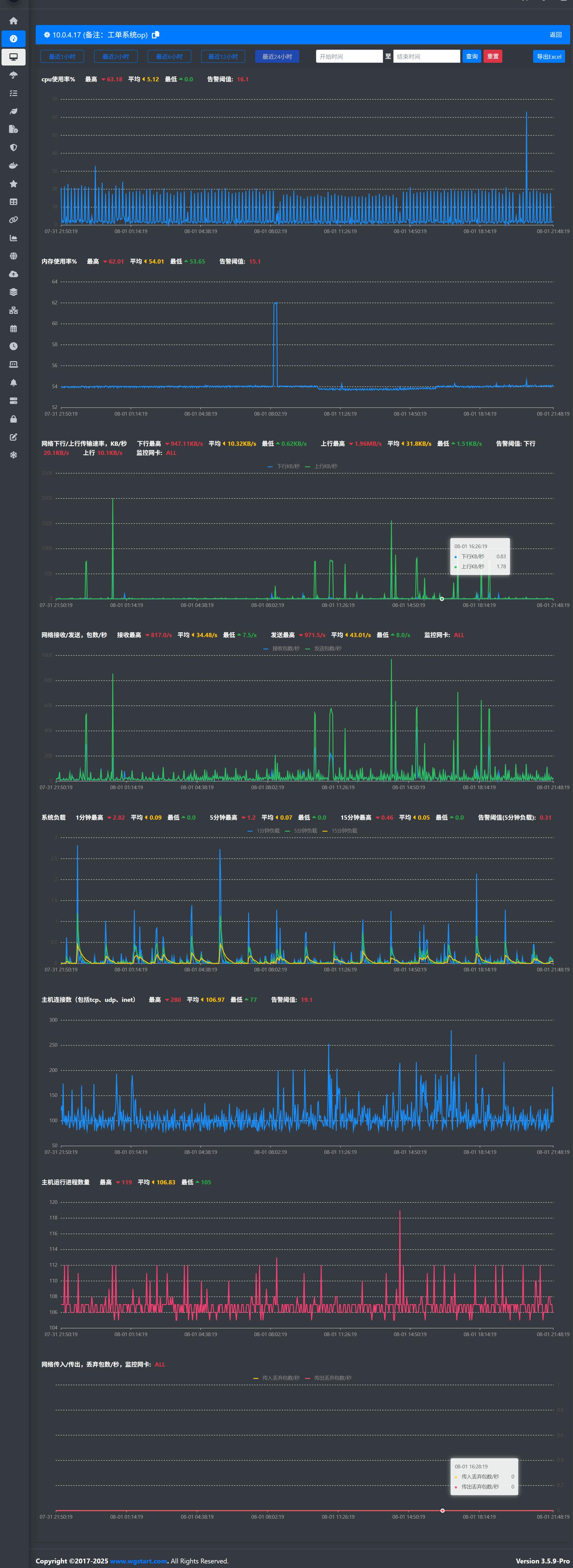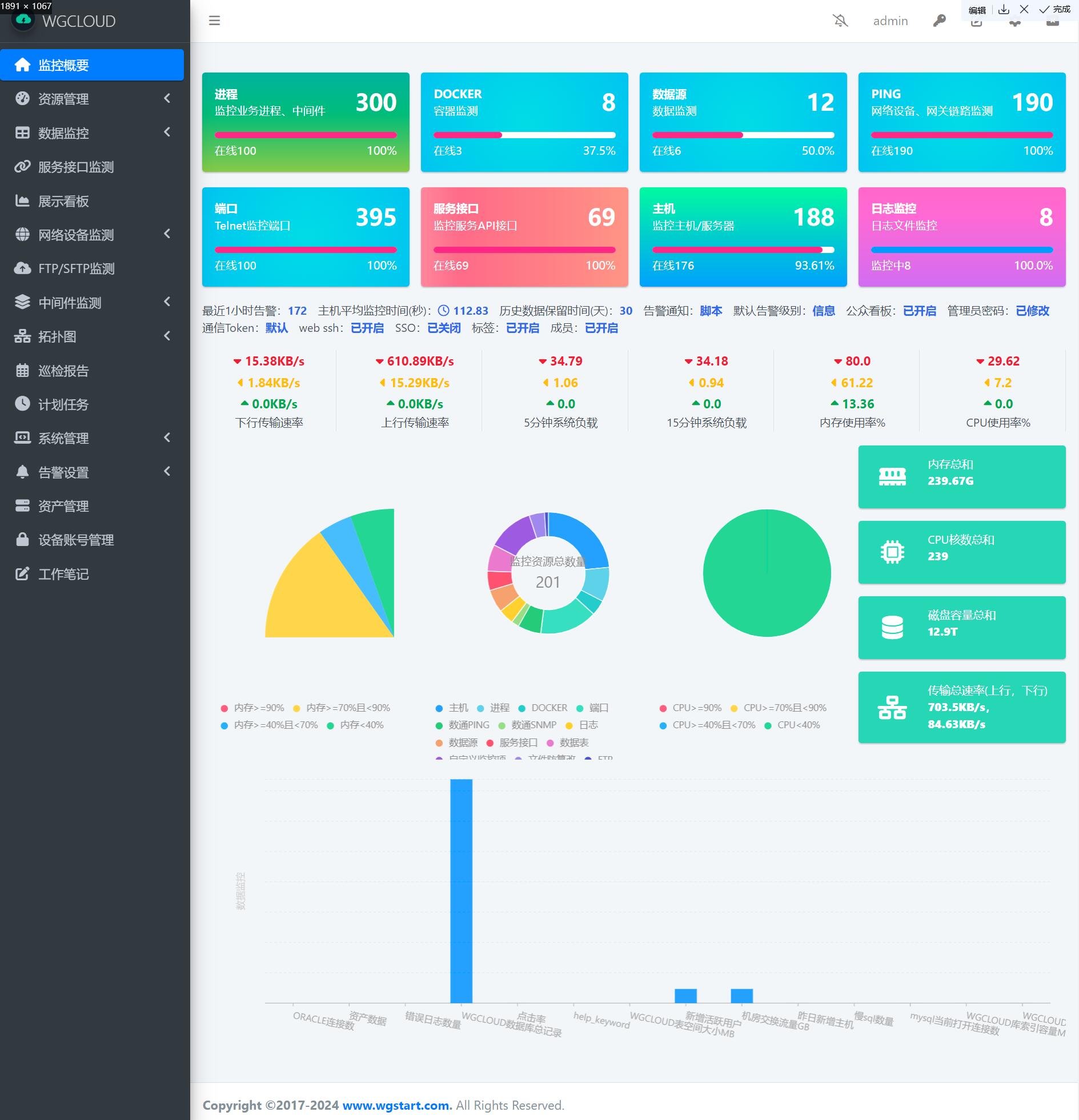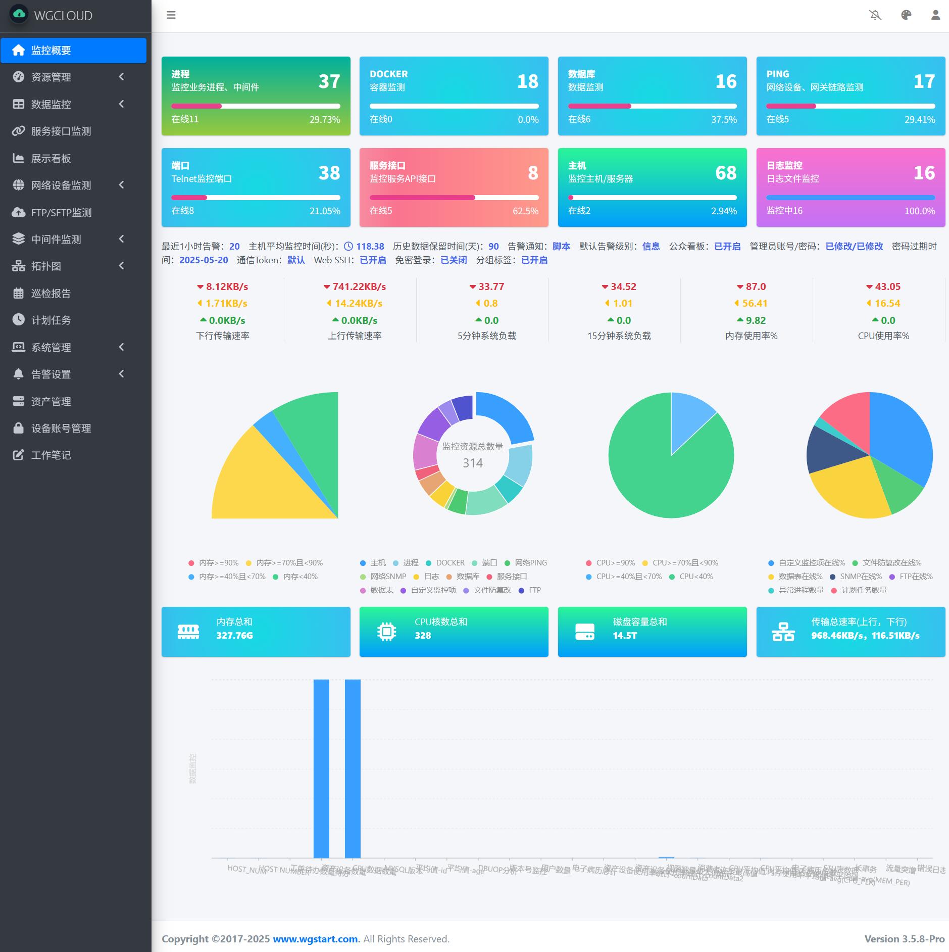 WGCLOUD可以管理和监控主机、服务器的运行状态,监控收集各种指标数据(包括cpu使用率,cpu温度,内存使用率,磁盘容量空间,磁盘IO,硬盘SMART状态,系统负载,连接数量,网卡流量和速率,MAC地址,硬件系统信息,GPU,防火墙状态,CRONTAB等信息)。支持监测服务器或主机上的进程应用、文件防篡改、端口、日志文件、DOCKER容器、数据库、数据表等资源。支持监测服务接口API、网络设备(如交换机、路由器、打印机)PING和SNMP监测、自定义监控指令、计划任务等。自动生成网络拓扑图,大屏可视化,web SSH,巡检报告,指令下发批量执行,FTP/SFTP监测,K8S监测,Kafka监测,RabbitMQ监测,ActiveMQ监测,Redis监测,Nginx日志检测,资产管理,设备账号管理,工作笔记,故障告警信息推送(如邮件、钉钉、微信、短信等)
