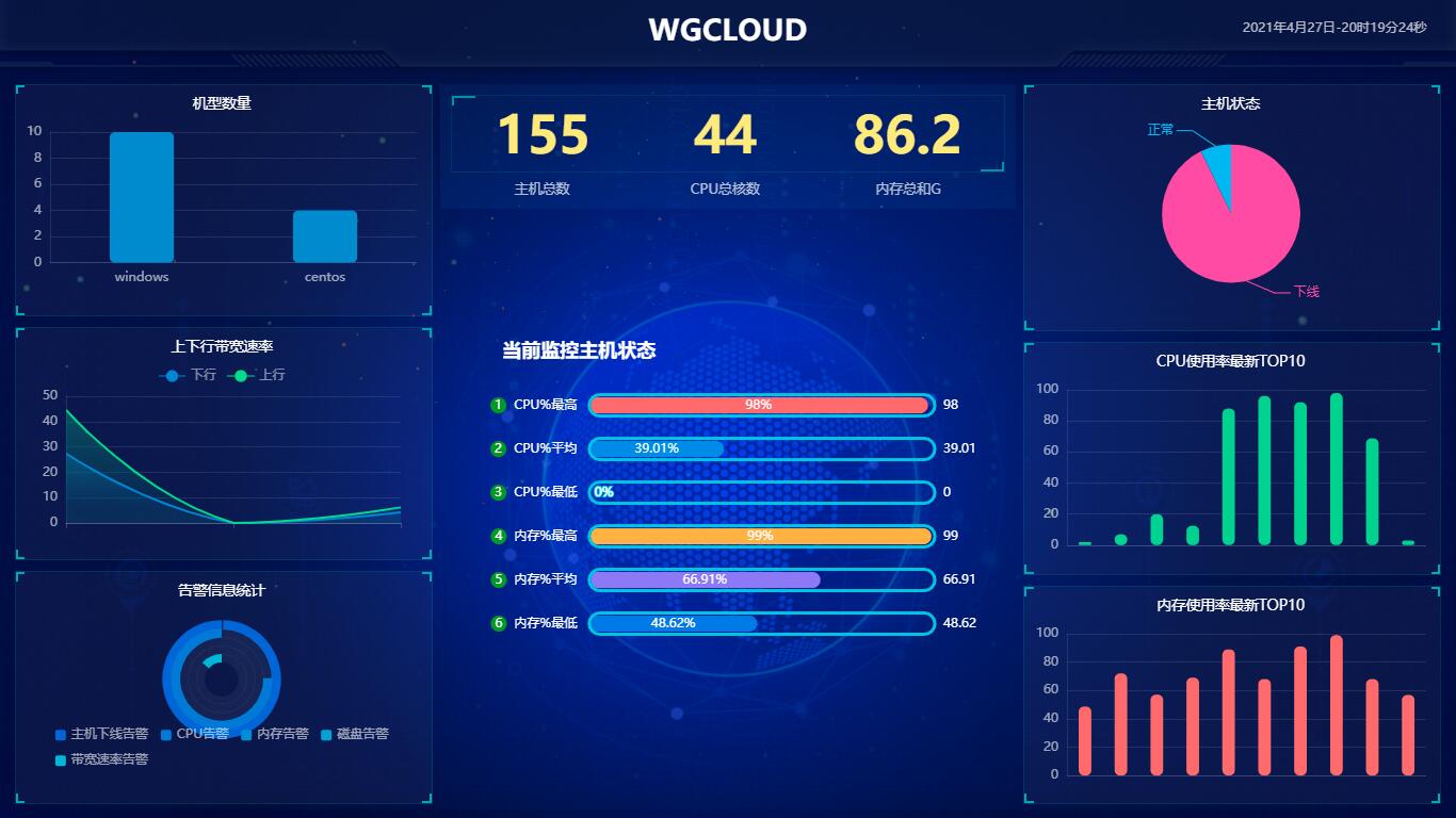 WGCLOUD是一款开源免费的运维监控软件,简单轻量,安装部署方便,性能优秀,自带高颜值大屏,实用,上手容易,尤其是对新手,可以在很短时间内搭建好自己的运维平台