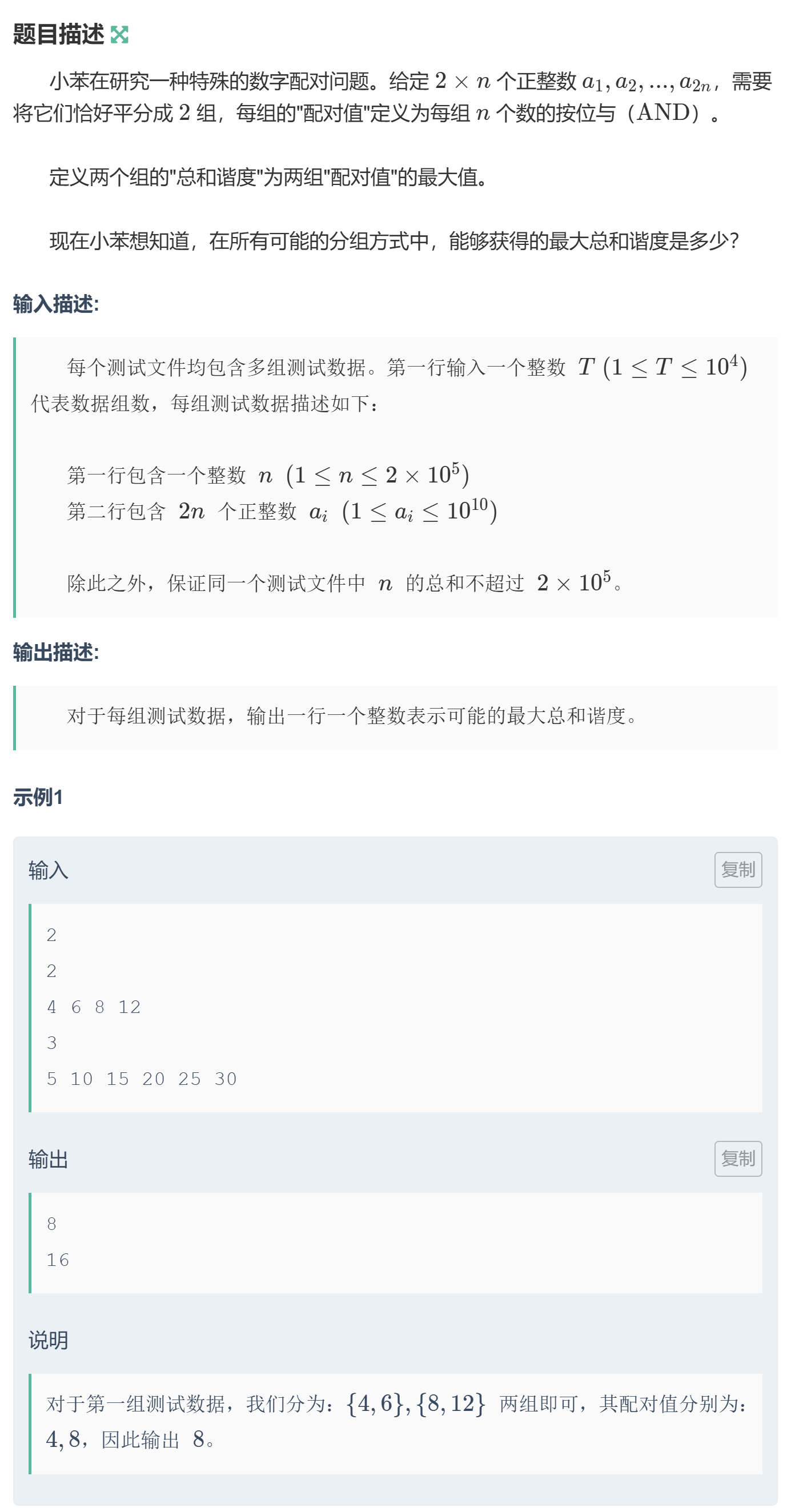 void solve(){ll n;cin>>n;vector<ll> a(n*2+1);// 读入2n个数字for(ll i=1;i<=n*2;i++){cin>>a[i];} ll ans=0;// vis数组:标记哪些数字当前还满足条件(初始都满足)vector<ll> vis(n*2+1,1);// 从高位到低位贪心(32位到0位)for(ll bit=32;bit>=0;bit--){vector<ll> v; // 存储当前位为1的数字索引vector<ll> nvis(n*2+1,0); // 新的vis数组// 遍历所有数字,检查当前位是否为1且满足之前条件for(ll i=1;i<=n*2;i++){if(!vis[i]) continue; // 跳过不满足之前条件的数字// 检查数字a[i]的第bit位是否为1if(a[i]>>bit & 1){v.emplace_back(i); // 记录满足条件的数字索引}} // 如果满足条件的数字足够组成两组(每组需要n个)if(v.size()>=n){// 设置答案的当前位为1ans |= (1LL << bit); // 更新vis数组:只保留在当前位为1的数字for(auto & i:v){nvis[i]=1;}vis = nvis; // 更新条件筛选}// 如果不够,保持当前vis不变,继续检查下一位}cout<<ans<<endl;