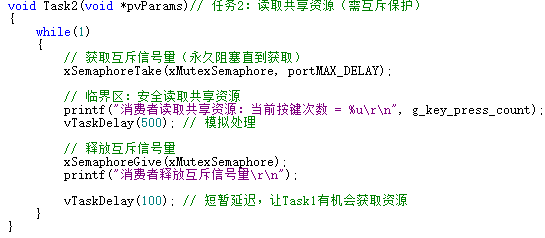 void Task2(void *pvParams)// 任务2:读取共享资源(需互斥保护)