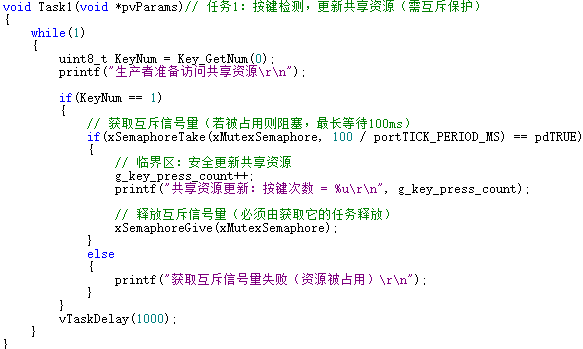 void Task1(void *pvParams)// 任务1:按键检测,更新共享资源(需互斥保护)
