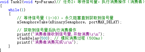 {while(1){// 等待信号量(1->0),永久阻塞直到获取到信号量xSemaphoreTake(xBinarySemaphore, portMAX_DELAY);// 获取到信号量后执行消费操作printf("消费者接收到信号量,开始消费\r\n");vTaskDelay(500); // 模拟消费过程(500ms)printf("消费者消费完成\r\n"); }