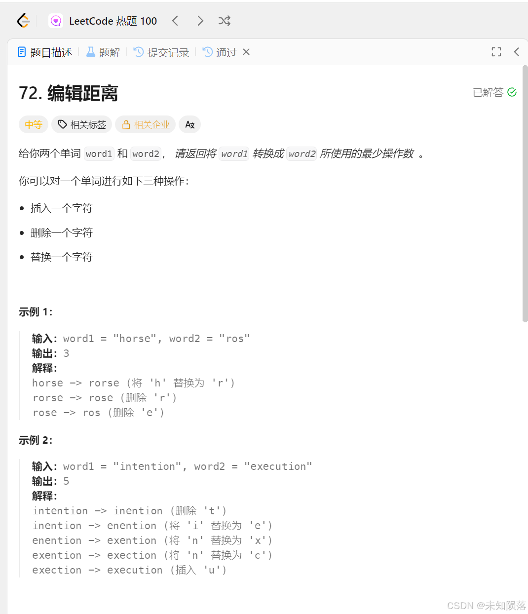 public:int minDistance(string word1, string word2) {int m = word1.size(), n = word2.size();if(m * n == 0) return m + n;vector<vector<int>> dp(m + 1, vector<int>(n + 1));word1 = " " + word1, word2 = " " + word2;for(int i = 0; i <= m; i++) dp[i][0] = i;for(int j = 0; j <= n; j++) dp[0][j] = j;for(int i = 1; i <= m; i++)for(int j = 1; j <= n; j++){if(word1[i] == word2[j]) dp[i][j] = dp[i - 1][j - 1];else{int x = dp[i][j - 1] + 1, y = dp[i - 1][j] + 1, z = dp[i - 1][j - 1] + 1;dp[i][j] = min(x, min(y, z));}}return dp[m][n];}