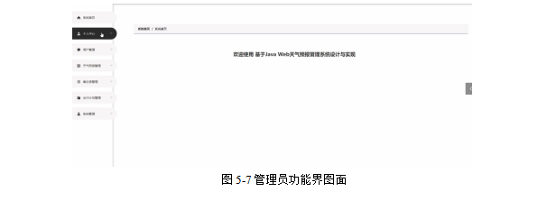 管理员登录系统后,可以对系统首页、个人中心、用户管理、天气预报管理、备忘录管理、出行计划管理、系统管理等功能进行相应操作,如图5-7所示。