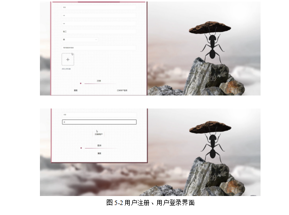 当用户进入前台系统进行相关操作前必须进行注册、登录,用户注册、用户登录界面如图5-2所示: