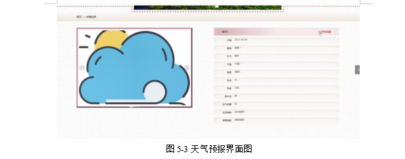 用户点击天气预报;在天气预报页面的搜索栏输入城市,进行查询,然后查看城市、封面、日期、星期、天气、气温、湿度、风向、风速、紫外线、空气质量等信息,还可以点击收藏或者评论等操作;如图5-3所示。