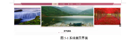 当游客打开系统的网址后,首先看到的就是首页界面。在这里,游客能够看到天气预报管理系统的导航条显示首页、天气预报、天气资讯、后台管理等。系统首页界面如图5-1所示: