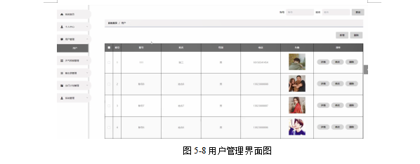 管理员点击用户管理;在用户管理页面对账号、姓名、性别、电话、头像等信息,进行查询,新增或删除用户信息等操作;如图5-8所示。